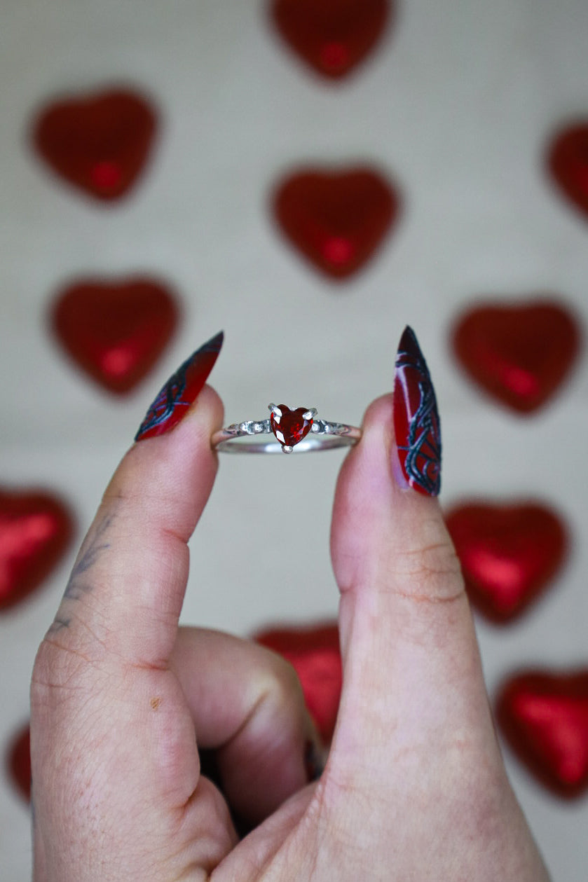 A delicate, faceted garnet heart takes centre stage, cradled by regal silver accents reminiscent of timeless romance and old-world elegance. Part of our Evermore Collection, this ring is designed to celebrate life’s special moments, whether it’s a milestone, a cherished memory, or simply a gift to yourself.